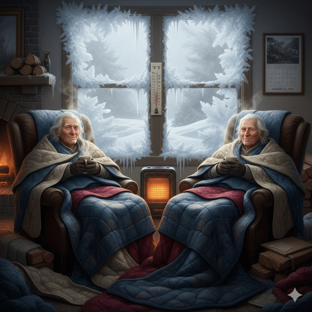 I guess if our power goes out like some people are expressing fears about, Jim and I do have enough clothing and blankets that we can wear layers and layers of clothes and sleep under a hefty pile of blankets if it gets to be too bad…but we will not be able to cook food….maybe we can heat some canned goods up over candles … we have plenty of candles.