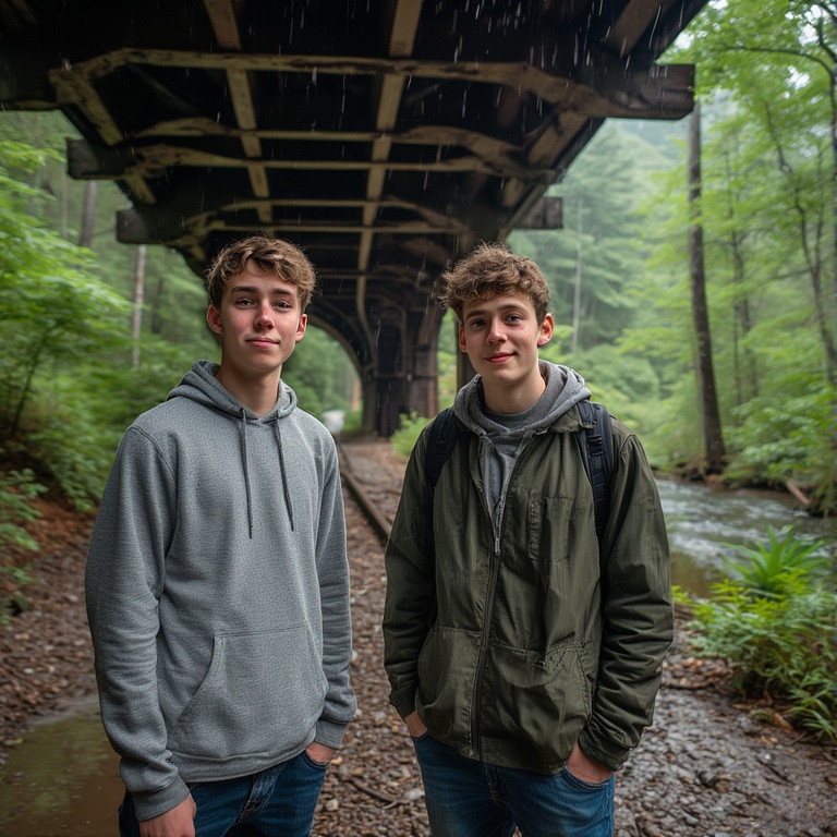 There were days when George and I went down to the wooded area by the creek and got caught in the rain. We always took shelter underneath a train trestle that did not offer much protection but it was better than none at all. We soon learned that it was wise to pack a tent when we ventured down there during the summer when it was prone to sudden cloud bursts. Great place to hunt arrow heads, go swimming in Jones’ pond on the creek, to explore, to camp out away from the boredom of our nothing little country village. We were 17 at the time. (Artificial representation of a young George and myself.)