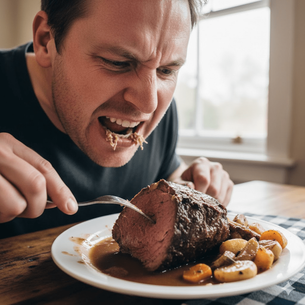 Almost Thirty dollars worth of un-cookable, nearly inedible roast beef from a major grocery chain…purest shit!! The image is from Gemini artificial intelligence. The man in the picture is not real and probably glad he isn’t.